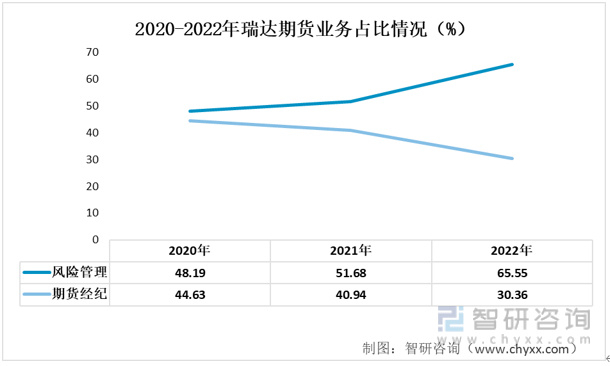 从近年来瑞达期货的业务占比情况来看,其风险管理业务的占比要大于期货经纪,且风险管理业务占比呈现持续上升的态势,而期货经纪业务占比呈现下降的态势。2022年,风险管理和期货经纪业务收入占比分别为65.55%和30.36%。