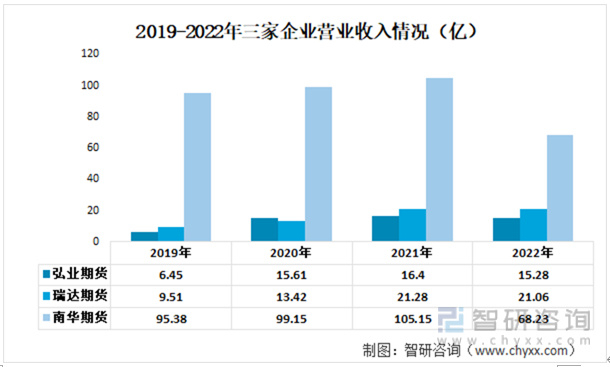 从2019年至2022年三家期货公司的营业收入情况来看,在2019年,弘业期货的营业收入为6.45亿,瑞达期货为9.51亿,南华期货为95.38亿。到2020年,弘业期货营业收入增至15.61亿,瑞达期货为13.42亿,南华期货为99.15亿。到2021年,三家公司的营业收入继续增长,弘业期货为16.4亿,瑞达期货为21.28亿,南华期货为105.15亿。然而,在2022年,弘业期货营业收入略微下降至15.28亿,瑞达期货为21.06亿,南华期货则大幅下降至68.23亿。