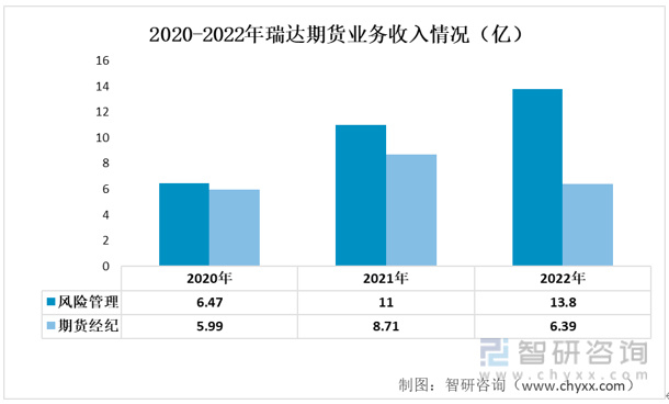 从近年来瑞达期货的业务收入情况来看,风险管理业务的收入要高于期货经济,且近年来风险管理业务收入呈现上升的态势,而期货经济业务收入在2021年实现了增长而在2022年却出现较大幅度的下降。2022年瑞达期货的风险管理业务收入为13.8亿,期货经纪业务收入为6.39亿。
