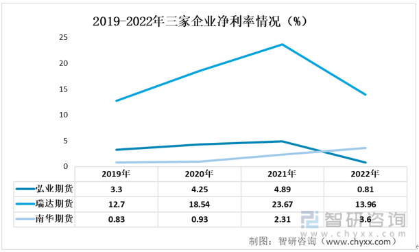 从2019年至2022年期间三家期货公司的净利率情况来看,在2019年,弘业期货的净利率为3.3%,瑞达期货为12.7%,南华期货为0.83%。到2020年,弘业期货的净利率增至4.25%,瑞达期货为18.54%,南华期货为0.93%。到2021年,三家公司的净利率继续增长,弘业期货为4.89%,瑞达期货为23.67%,南华期货为2.31%。然而,在2022年,弘业期货的净利率大幅下降至0.81%,瑞达期货为13.96%,南华期货则进一步上升至3.6%。