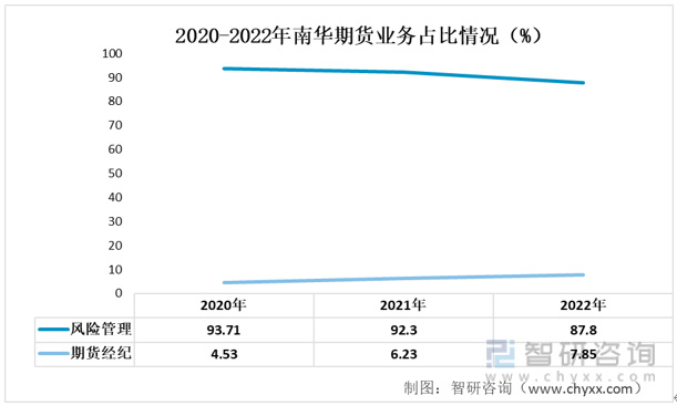 从近年来南华期货的业务占比情况来看,其风险管理业务占比要远大于期货经纪,2022年南华期货的风险管理业务占比为87.8%,而期货经纪业务为7.85%。