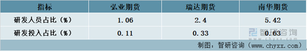 从2022年三家企业的科研投入情况来看,南华期货为三家企业科研投入水平最高,其研发人员数量占比为5.42%,研发投入占比为0.63%。
