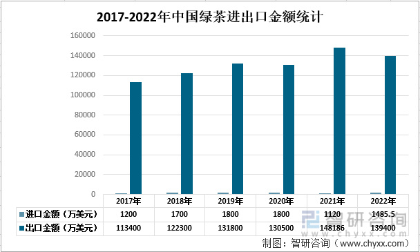 2021年中国绿茶进口金额仅有1120万美元,较2020年减少了680万美元,2022年中国绿茶进口金额为1485.5万美元;2021年中国绿茶出口金额为148186万美元,较2020年增长了17686万美元,2022年中国绿茶出口金额为1349400万美元。