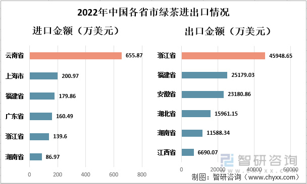 2022年中国各省市绿茶进出口情况