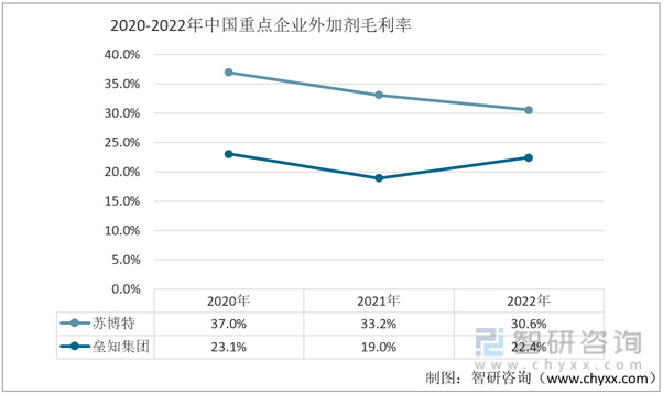 2020-2022年中国重点企业外加剂毛利率