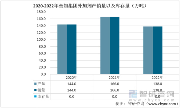 2020-2022年垒知集团外加剂产销量以及库存量(万吨)