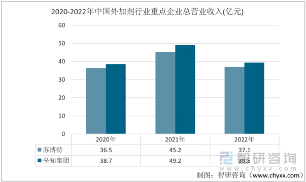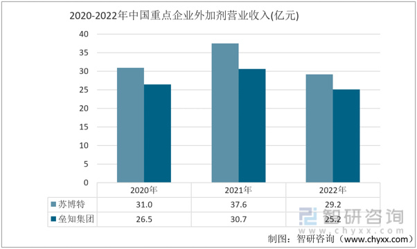 2020-2022年中国重点企业外加剂营业收入(亿元)