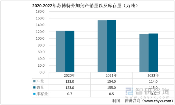 2020-2022年苏博特外加剂产销量以及库存量(万吨)