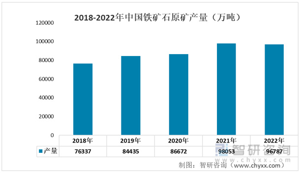 铁矿石是冶炼钢铁的重要原材料。近年来我国铁矿石产量呈现上升的态势。2021年中国铁矿石原矿产量为98053万吨,同比增长13.1%。2022年我国铁矿石原矿产量为96787万吨,较上年稍有下滑。