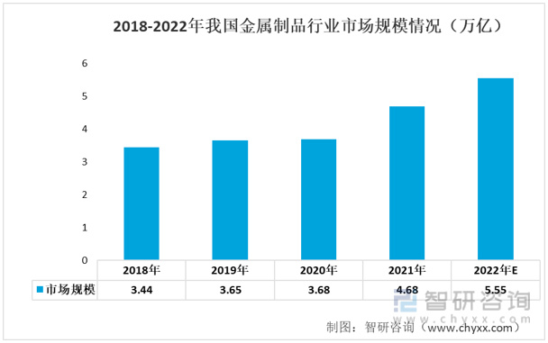 从近年来我国金属制品行业市场规模情况来看,呈现不断上升的态势,2021年我国金属制品行业市场规模为4.68万亿,2022年全年市场规模将达到5.55亿元。