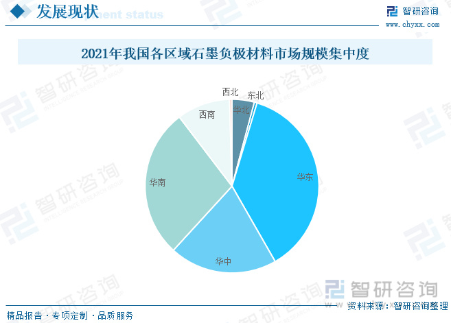 石墨负极材料应用于锂电池制造业,受下游锂电池产业区域布局的影响,我国石墨负极材料消费具有明显的区域性特征。2021年以江苏、福建、江西、安徽为主的华东地区石墨负极材料市场规模为 101.84亿元;以广东为代表的华南地区规模为76.49亿元;河南、湖北、湖南所在的华中地区规模为55.09亿元;2021年华东、华南、华中三地区石墨负极材料市场占比合计达到84.99%。