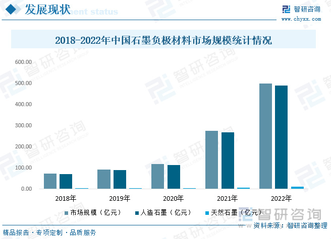 内容概况:电动汽车的发展极大的促进了石墨负极材料的市场规模,据统计2022年中国石墨负极材料市场规模达到500.75亿元,同比增长82.3%,相较于2018年市场规模增长了428亿元,2018到2022年复合增长率为62.1%。未来对新能源汽车的需求日益增长,石墨负极材料的市场规模将持续升高。