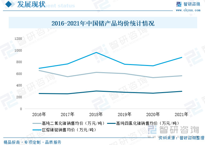 锗产品主要有高纯二氧化锗、高纯四氯化锗和区熔锗锭。据统计,2021年中国高纯二氧化锗、高纯四氯化锗和区熔锗锭的销售均价分别为567 万元每吨、301万元每吨、876.8万元每吨。锗的应用领域广泛,随着全球锗产品消费商的发展壮大,总体上锗产品的供需平衡关系仍未改变,锗产品的未来成交量将保持平稳态势。