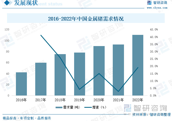 锗要应用在太阳能电池、红外光学、光纤、PET催化剂、合金、医疗保健等领域。长期来看,锗产品持续保持供不应求的态势,但各生产企业回收的锗废料将会在一定程度上缓解锗产品的供需紧张态势。2022年锗的需求量约为110.3吨,同比增长19.2%,2016年到2022年复合增长率为17.34%,对锗的需求量逐年攀升,预计在未来高新技术的发展的锗材料的需求将持续增长。