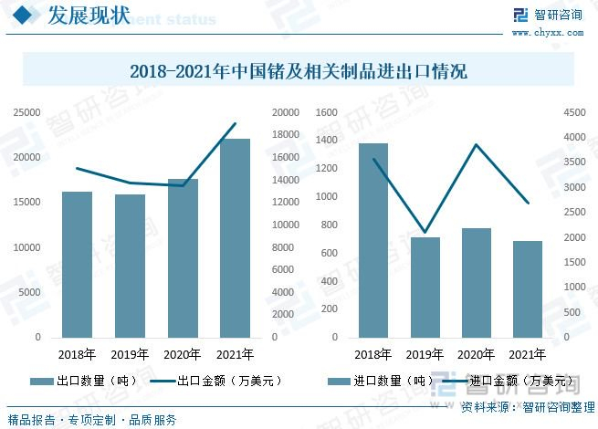从进出口情况来看,2021年中国锗及相关制品出口数量为22139.448吨,同比增长25%,出口金额为19003万美元,同比增长40%。进口数量为686.53吨,同比减少11.7%,进口金额为2687万美元,同比减少30.3%。随着行业的稳步崛起以及海外市场业务的不断拓展,我国锗及相关制品出口将延续增长态势,锗行业进口规模将呈现出波动态势。