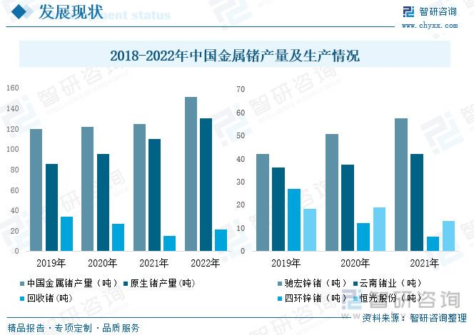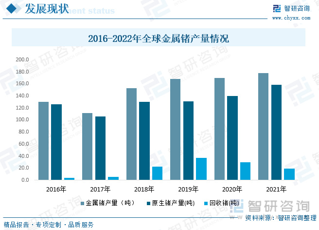 中国锗矿产资源丰富,新能源的快速发展对锗的需求也急速增加,对锗的产能有了新的要求。据统计,2022年中国锗的产量约151吨,同比增长20%,其中原生锗的产量为130吨,回收锗的产量为21吨。中国金属锗行业主要企