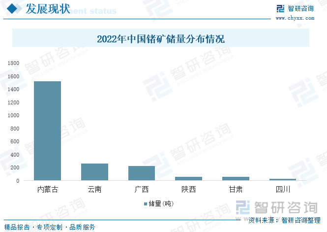 锗作为分散元素,在地壳中丰度7×10-6。全球已经探明锗资源的储量8600t,主要分布在亚洲、欧洲和北美,涉及国家有美国、中国和俄罗斯。其中,美国锗资源储量3870吨,占全球储量的45%,居于首位;俄罗斯860吨,占全球储量的10%。需要指出的是,锗通常作为Pb+Zn±Ag矿床和富锗煤矿的副产品,因此Pb+Zn±Ag矿和富锗煤矿的分布在一定程度上也可代表锗资源分布。中国锗矿资源较为丰富,储矿量接近2163吨,查明锗矿资源主要分布于全国12个省(区),其中内蒙古、云南、广西、陕西、甘肃、四川储量最多。