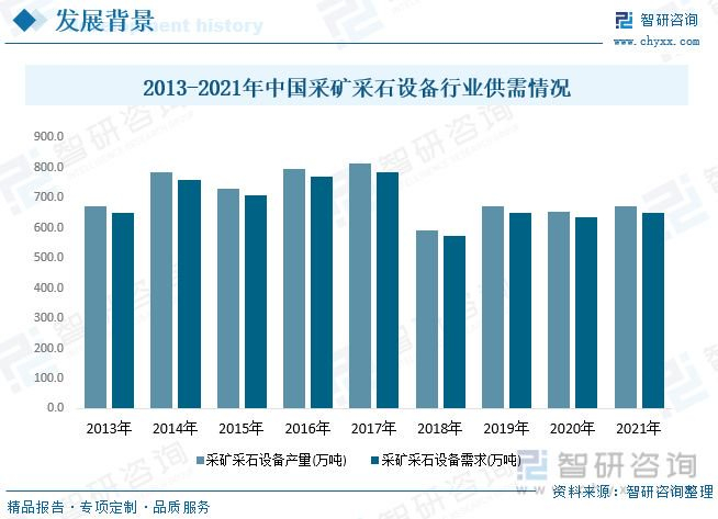 采矿采石设备行业市场需求方面,作为采矿和选矿的设备,采矿采石设备多应用于煤炭开采及洗选业、有色金属矿选业、黑色金属矿选业、石灰岩矿选业、石英岩矿选业和工程建设项目等领域,其主要应用是帮助煤炭、有所金属、钢铁、建材等工业部门进行矿山开采,同时还用于对上述行业所需原材料进行在加工和深加工,作为先进的技术设备,采矿采石设备还能为公路、铁路和水电等特大工程建设项目服务,为其施工提供方便。近年来,国内采矿采石设备行业供需快速增长,到2021年采矿采石设备行业产量达到了670.2万吨,需求量650.7万吨。
