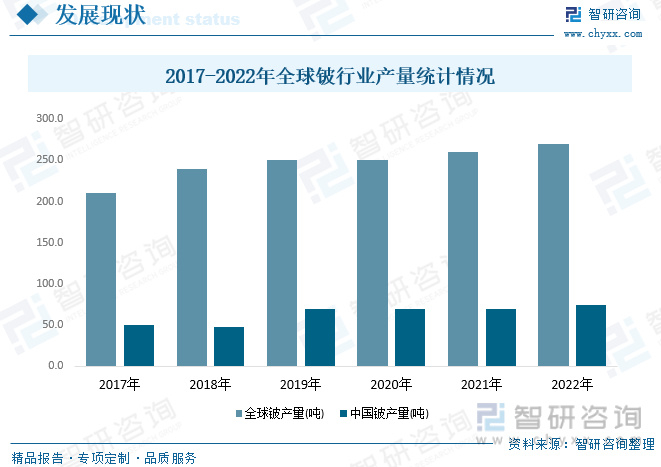 随着社会的发展,对铍的采集和处理技术逐渐完善,因为铍的特性也使其的需求逐渐增加。2017年全球铍的产量为210吨,到了2022年全球铍的产量约为270吨,增长了60吨,复合增长率为5.15%。2017年中国铍的产量为50吨,2022年产量达到约74吨,增长了24吨,复合增长率为8.15%。预计在未来,对铍的需求逐渐增加,铍的产量将持续攀升。