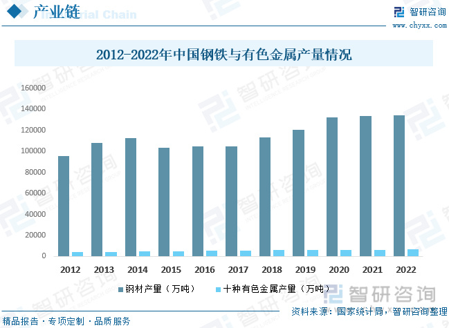 钢材作为大宗商品,受宏观经济环境的波动影响较大。近年来,受到全球经济的影响,国内钢材市场价格波动较大,从而对本行业的盈利水平造成一定影响。从我国钢材近年产量来看,2012-2022年我国钢材产量不断增长,2012-2022年钢材产量CAGR为3.44%。2022年有色金属行业克服疫情反复不利影响,把握国内和国际市场复苏机遇,持续深化供给侧结构性改革,保障产业链供应链有效供给,加快推进传统产业智能化、绿色化、高端化,行业运行整体平稳,截至2022年我国十种有色金属产量为6793.6万吨,同比增长4.89%。