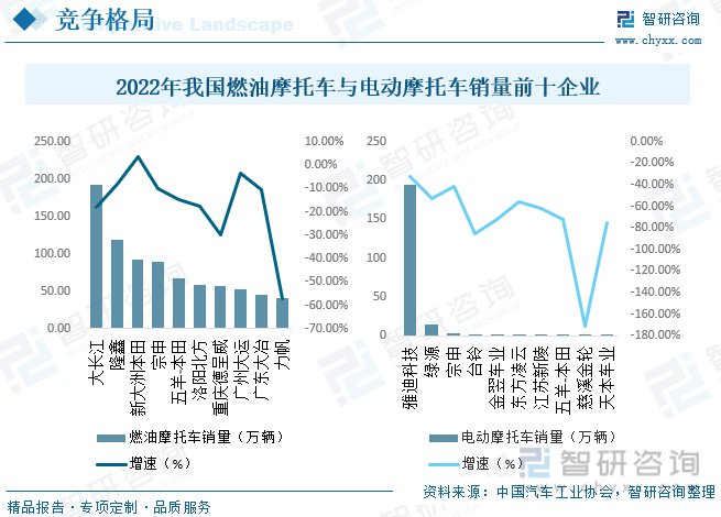 近年来,随着摩托车行业的快速发展,国内摩托车企业数量逐渐增长。部分国内外摩托车企业为行业的技术进步和快速发展做出了贡献,整个摩托车行业已高度市场化。随着行业结构调整的深入,市场竞争的加强,将会有更多的企业被市场淘汰,退出市场,行业生产集中度将进一步提高,“强者愈强”的龙头效应将更为显著。据统计,2022年1-12月燃油摩托车销量前十名企业(集团)为大长江、隆鑫、宗申、力帆、新大洲本田、银翔、五羊-本田、洛阳北方、广州大运和广东大冶分别销售234.39万辆、128.86万辆、98.83万辆、97.24万辆、89.58万辆、81.46万辆、79.95万辆、71.63万辆、53.94万辆和50.86万辆。在电动二轮轻便摩托车(V≤50km/h)领域,雅迪科技集团有限公司独占鳌头,2022年1-12月销量为194.29万辆,同比下降37.44%。