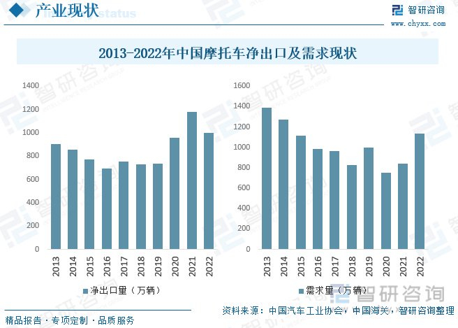 从1993年起,中国摩托车产、销量已连续20多年为世界第一,约占世界产、销量的1/2以上。产品出口到世界180多个国家和地区,出口量连续10多年为世界第一,甚至可以说,凡是有摩托车的地方,就有“中国制造”,摩托车已成为中国最具全球化特点的机电产品之一。在中小排量摩托车制造领域,中国的产品水平已和摩托车生产强国的水平相当,据统计,2022年我国摩托车净出口量为996.55万辆,需求量为1132.67万辆。