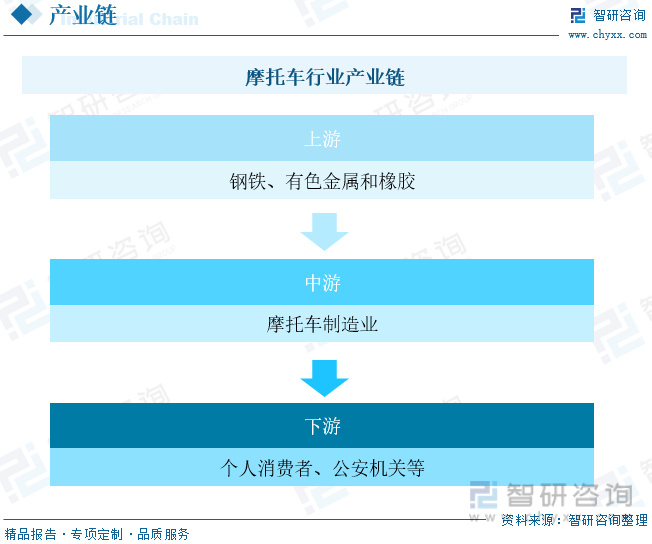 摩托车的生产制造需要使用发动机和各种零配件,主要原材料有钢材、有色金属和橡胶等。行业内具备自主开发能力的摩托车企业一般生产发动机及关键零部件,既满足自用亦可向行业内其他企业提供。其余大部分零配件的需求是通过向上游零配件制造商采购来解决。摩托车下游为居民消费者及公安机关等企事业单位,因此,销售渠道的分布、生活水平的高低、消费习惯、特定的生产用途和需要将影响产品的最终销售。