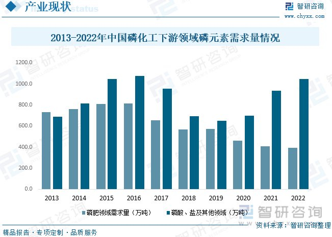 具体从需求量方面来看,近年来国家政策推动精细化工行业发展,带动以磷酸等其他磷化工产品需求,同时加之农用化肥施用量持续下降,导致国内磷化工下游磷肥领域磷元素需求量持续下降,而磷酸、盐及其他领域磷元素需求量持续增长。数据显示,2022年中国磷肥领域磷元素需求量约为394.2万吨,磷酸、盐及其他领域磷元素需求量约为1047.4万吨。