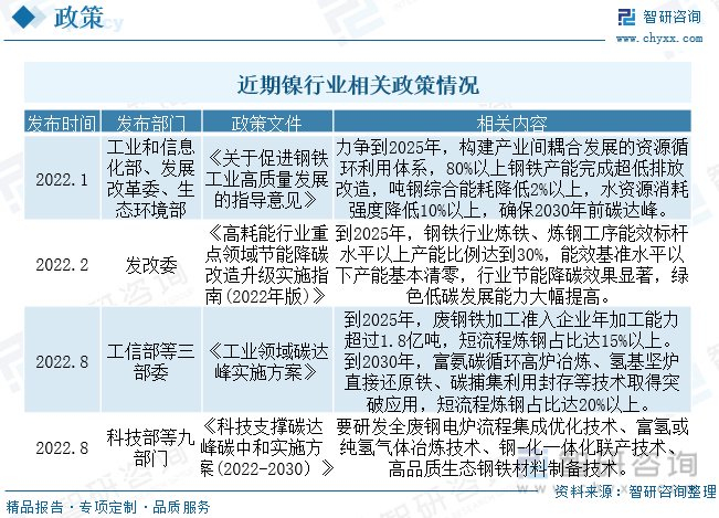 2022年1月,工信部、发改委、生态环境部发布《关于促进钢铁工业高质量发展的指导意见》严禁新增钢铁产能,80%以上钢铁产能将于2025年完成超低排放改造,推进企业兼并重组,打造若干世界一流超大型钢铁企业集团,引导中国钢铁产品、装备、技术、服务等协同“走出去”。鼓励生铁、直接还原铁、再生钢铁原料、钢坯、钢锭等资源性产品和半制成品进口。镍主要用于不锈钢和合金钢等领域,下游关键领域环保政策持续趋严,一定程度上影响产品需求。