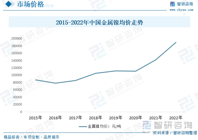 我国镍均价变动而言,随着全球镍资源供给持续趋紧,加之作为全球主要需求市场的中国市场需求量持续扩张,全球金属镍均价持续增长,我国镍以进口为主,全球镍均价持续增长带动我国镍价格持续走高,数据显示,2015年我国金属镍均价约8.74万元/吨,2021年国内新能源动力电池带动镍供需持续偏紧,整体金属镍均价至14.2万元/吨左右,2022年作为国内新能源汽车补贴最后一年,国内新能源汽车销量大增继续加剧供不应求现象,2022年我国金属镍均价增长至19.01万元/吨。
