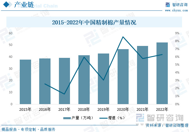 精制棉以棉短绒为原料,经过蒸煮、热洗、冷洗、酸洗、漂白、酸处理、水洗、碾压驱水、气流烘干等工艺制得的均匀疏松白色絮状物,主要化学成分是纤维素、木质素和半纤维素。精制棉是国民经济发展的重要基础性材料,各行各业的发展特别是新型产业产品的发展,都离不开精制棉。精制棉在我国发展经历了半个多世纪,从几千吨发展到现在产能50万吨以上,行业产量也随之快速增长。据资料显示,2020年我国精制棉产量为46.52万吨左右,到2022年产量约为52.32万吨,同比增长6.3%。
