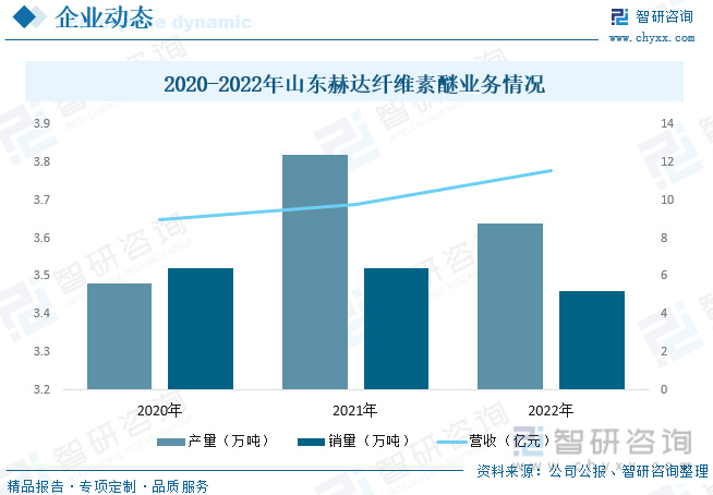 山东赫达集团股份有限公司成立于1992年,于2016年8月登陆深圳证券交易所中小板,是一家国际化纤维素醚生产企业,同时也是一家打通纤维素醚上下游产业链,贯通植物肉、植物胶囊等领域的生态复合型集团公司。集团拥有纤维素醚事业部、赫尔希胶囊事业部、化工设备事业部、福川化工事业部4大事业部;业务涵盖中高端纤维素醚、植物胶囊、植物肉、化工设备、原乙酸三甲酯和双丙酮丙烯酰胺等产品范围。山东赫达是国内同行中少数具备自主研发并同时大规模生产中高端型号建材级、医药级和食品级非离子型纤维素醚的企业之一,公司现有纤维素醚设计产能7.5万吨/年,位于行业领先地位。据资料显示,2022年公司纤维素醚产品产量为3.64万吨;销量为3.46;实现营收11.58亿元。
