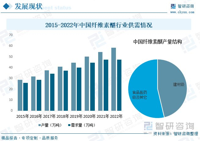 我国纤维素醚行业较国外发达地区起步较晚,但经过十多年的努力,我国纤维素醚行业从无到有、经历了突飞猛进式的大发展,在全球同行业的竞争力日益增强,已在建材级产品市场形成了巨大的产业规模和本土化优势,基本实现了进口替代,同时,在医药级、食品级领域也取得了相应成功,行业规模迅速扩张。据资料显示,2022年我国纤维素醚产量约为58.36万吨,同比增长7.3%;需求量约为49.53万吨,同比增长4.3%。