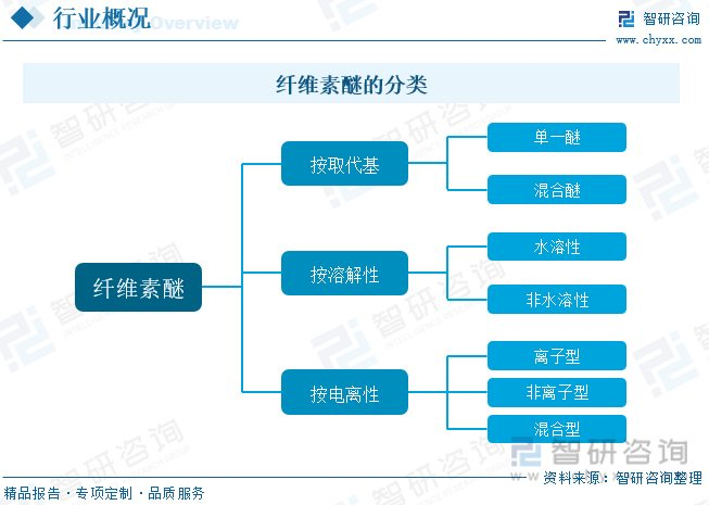 纤维素醚的种类多样,按照取代基种类的不同,纤维素醚可以分为单一醚和混合醚;根据电离性可以分为离子型、非离子型和混合型产品;根据溶解性可以将纤维素醚分为水溶性和非水溶性产品。