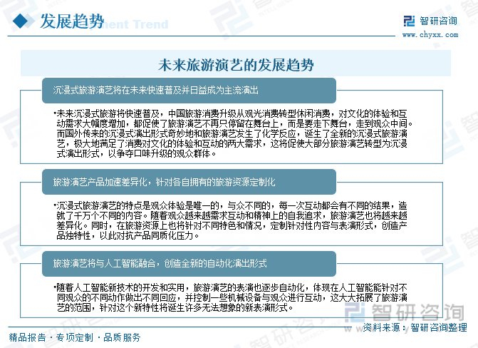 旅游演出的开展能吸引旅游者,延长其在旅游地或景区的逗留时间,从而产生住宿、餐饮、交通等多方面的溢出效益,带来高额商业利益。与传统演出相比,旅游演艺有其独特的特点,未来几年,沉浸式旅游演艺将在未来快速普及并日益成为主流演出;演艺产品加速差异化,针对各自拥有的旅游资源定制化;旅游演艺的表演也逐步自动化,将与人工智能融合,创造全新的自动化演出形式。