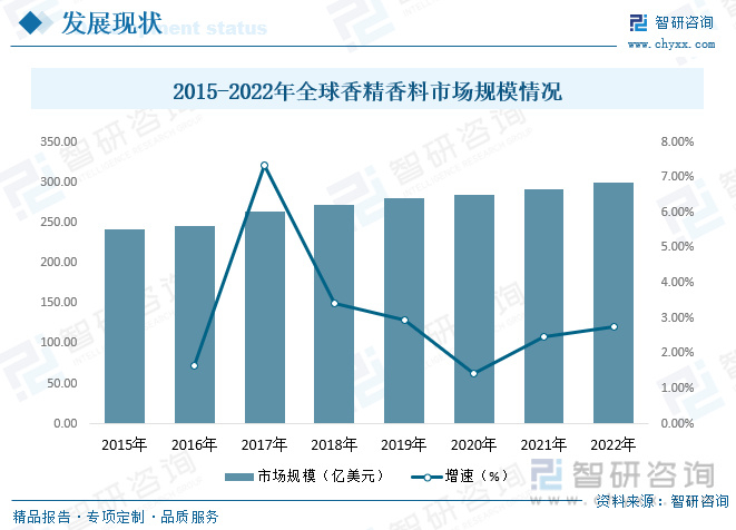随着世界各国(尤其是发达国家)经济的发展,消费水平不断的提高,人们对食品、日用品品质要求愈来愈高,工业的发展,消费品的拉动,加速了世界香料工业的发展。全球香精香料产品种类超过6000余种,市场规模从2015年241亿美元增长到2022年的299亿美元,复合增长率为3.13%。