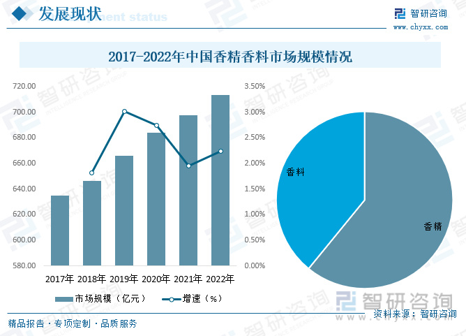 随着我国经济的发展和国民生活水平的提高,以及全球香料香精工业的跨国转移,我国香料香精需求和供给双向增长,香料香精行业发展较快、市场规模不断扩大。经过多年的快速发展,国内香料香精行业也逐步完成了从小作坊式生产到工业化生产、从产品仿制到自主研发、从进口设备到专业设备的自主设计制造、从感官评价到使用高精仪器检测、从技术人员的引进到专业人才的自主培养、从野生资源采集到引种栽培和建立基地等多方面的转变,国内香料香精制造行业已逐步发展成一个较完整的工业体系。2022年我国香精香料市场规模达到713.22亿元,其中香精市场份额占到61%,香料占到39%。