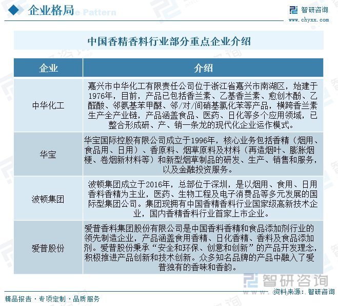 目前,中国香精香料行业的发展趋势还是相当明显的。我国也是世界上最大的天然香精香料生产国。总的来说,中国香精香料工业发展迅速,取得了长足的进步,也涌现了一批自主创新龙头企业。目前我国香精香料行业重点企业有嘉兴市中华化工有限责任公司、华宝国际控股有限公司、中国波顿集团有限公司、爱普香料集团股份有限公司等。