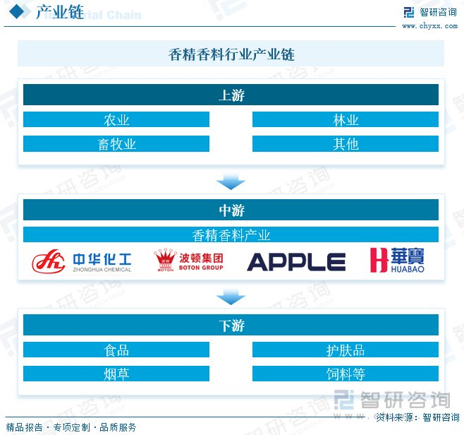 香精香料的原材料主要包括薄荷、柠檬、玫瑰、薰衣草、岩兰草等香料植物,和麝香、龙涎香等动物(香料)。显然,其产业链的上游涵盖了农业、林业、畜牧业等诸多领域,涉及到种植、养殖、农业科技、采收加工等资源性基础环节。由于香精香料是食品、护肤品、烟草、饮料、饲料等行业的重要辅料,这些行业就构成了香精香料行业的下游。近年来,随着这些下游产业的发展,其对香精香料的需求不断增加,同时也对香精香料产品提出更高的要求。