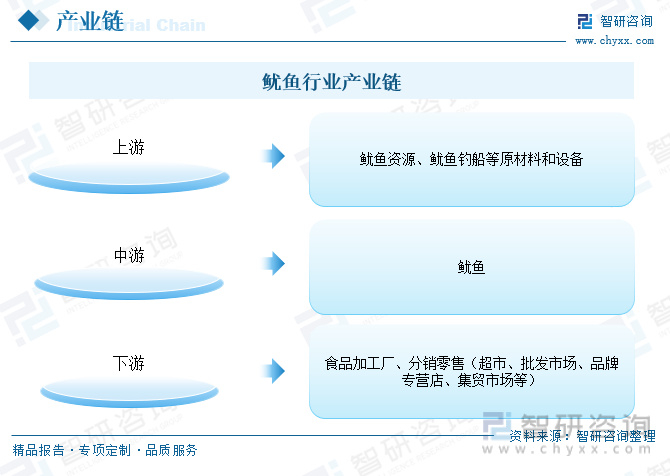 鱿鱼行业产业链上游主要为鱿鱼资源、鱿鱼钓船等原材料和设备;我国鱿鱼主要来自于包括近海捕捞和远洋捕捞在内的野生捕捞,鱿鱼行业产业链下游主要通过直销给食品加工厂、分销零售以及外贸出口等渠道进行销售,而鱿鱼加工产品通过超市、批发市场、品牌专营店、集贸市场等渠道到达餐饮市场或消费者手中。