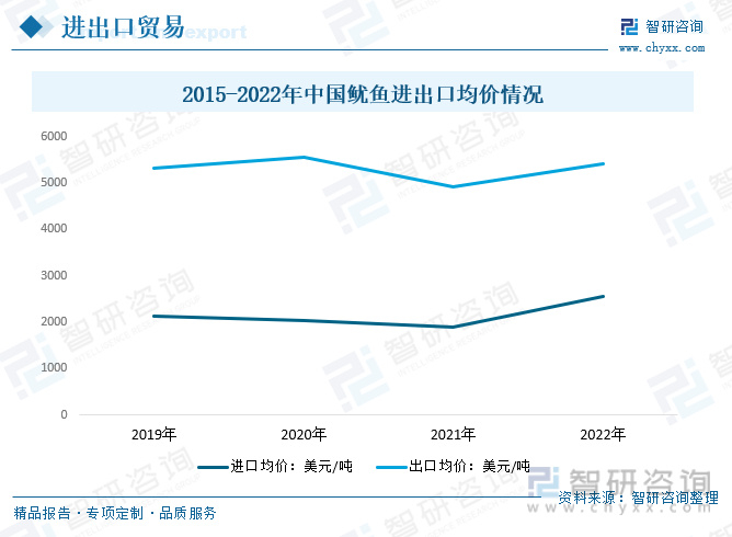 2022年我国鱿鱼相关产品进口均价2554.6美元/吨,较2021年增长671.79美元/吨;出口均价5412.38美元/吨,较2021年增长501.12美元/吨。