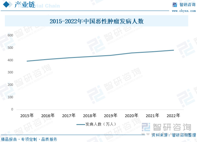 随着我国人口增长及老龄化程度加剧、叠加环境污染及我国固有的饮食生活习惯等多种因素,我国肿瘤患者持续增加。2021年,中国恶性肿瘤发病人数470万人,较上年增加10万人,2022年我国恶性肿瘤发病人数约为481万人。