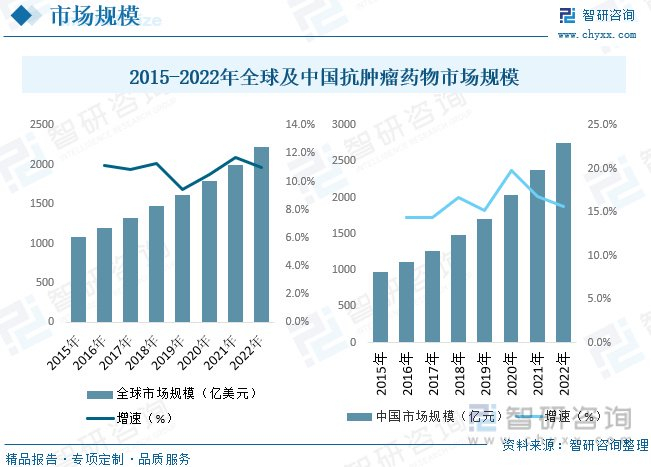 据世界卫生组织统计,癌症是导致人类死亡、缩短预期寿命、威胁人类生命健康的主要原因。目前,世界恶性肿瘤的发病率和死亡率逐年上升,我国恶性肿瘤死亡率居世界首位。我国恶性肿瘤死亡的主要原因有:物理致癌因子,如X射线、电离辐射;化学致癌因子,如亚硝酸盐、黄曲霉毒素;病毒致癌因子,如乙型肝炎病毒、疱疹病毒。抗肿瘤治疗方法主要有手术、化疗、放疗、免疫治疗、中药治疗等,而化疗是目前治疗恶性肿瘤的主要手段。而抗肿瘤药物是肿瘤治疗的有效武器,救治或者延长了患者的生命。随着医学科技的进步,新型抗肿瘤药物不断涌现,为部分肿瘤患者带来了生的希望。据统计,近年来全球及中国抗肿瘤药物市场规模快速增长,截至2022年全球抗肿瘤药物市场规模约为2220亿美元,中国抗肿瘤药物市场规模约为2759亿元。