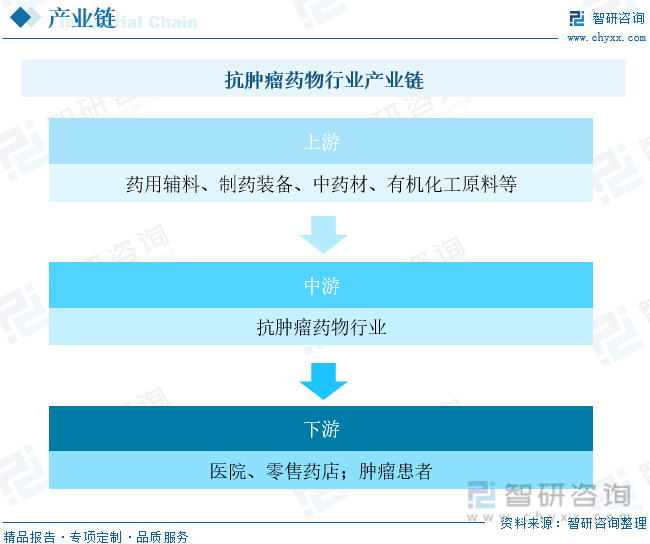 抗肿瘤药物行业的上游主要为有机化工原料、中药材、药用辅料及原材料行业,上游行业的技术水平、供给能力、价格波动对本行业的经营有一定的影响。抗肿瘤药物行业的下游为医院、零售药店和消费者。近年来,国家颁布一系列医疗体制改革措施,逐步完善药品价格形成机制,规范药品流通秩序、减少流通环节,积极稳妥推进公立医院改革,积极探索医药分开、营利性和非营利性分开的有效形式,这些都有效的促进了整个医药市场健康有序的发展,也推动了医药产品市场规模的稳步增长。