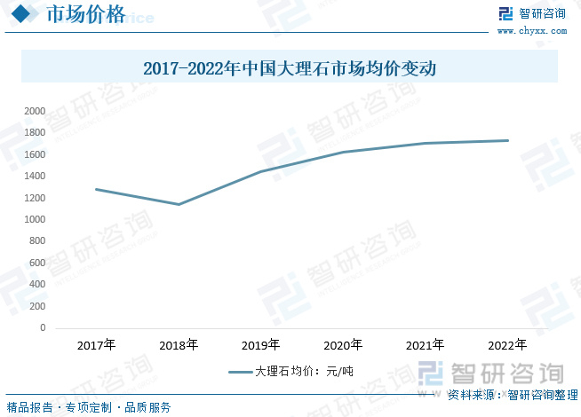 国内大理石增长速度进入缓和态势,2022年天然大理石作为房屋装修不可替代的材料市场需求较好。中国国内市场对大理石的需求也在稳步发展。尤其是高品质的名牌大理石供不应求,很大程度上依赖进口。近几年我国大理石行业平均价格整体呈现上涨态势,从2017年的1280.3元/吨增长到2022年的1734.1元/吨。未来几年,随着大理石市场需求趋于平缓,国内大理石行业平均价格呈现下滑态势。
