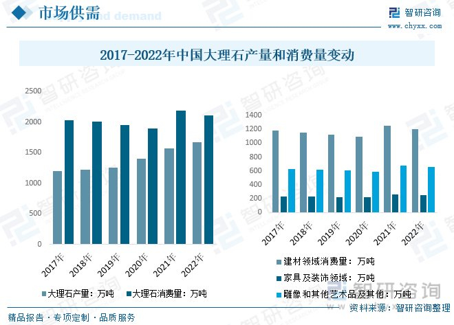 近年来,国际石材工业发展十分迅速。整个石材行业的发展明显快于全球经济的发展,伴随着人民生活水平的不断提高,大理石等石材早已走进平常百姓家,在国内广泛应用于地面铺装、橱柜和家具的台面装饰,随着需求持续曾展,我国大理石产量和需求量逐年递增,数据显示,2017年我国大理石行业产量约1193.9万吨,到2022年国内大理石行业产量达到了1665.9万吨,2017年我国大理石行业消费量2034.2万吨,到2022年大理石行业消费量达到了2111.7万吨。其中,建材领域消费量1206万吨;家具及装饰领域250.2万吨;雕像和其他艺术品及其他655.5万吨。