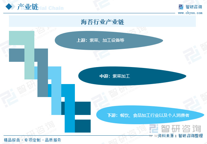 海苔由紫菜加工而成,因此,海苔产业链上游环节主要包括紫菜、加工设备等,中游环节主要是紫菜加工,下游环节主要是终端消费,包括餐饮、食品加工行业以及个人消费者。