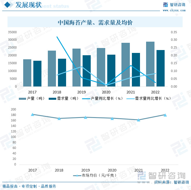 内容概况:2022年中国海苔产量和需求量分别达28985吨和23487吨,与此同时,产品价格也增幅明显,2022年中国海苔市场均价达181.5元/千克,随着中国紫菜深加工产业的快速发展以及主要海苔生产加工企业市场推广力度的加强,中国消费者对海苔产品的认知度逐步提升,中国海苔产销将继续保持增长趋势。