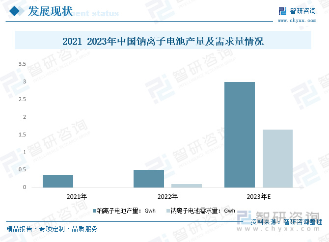 内容概要:随着宁德时代在车展上宣布其钠离子电池首发落地奇瑞车型,钠离子电池迎来产业化,行业产量及需求量迅猛增长。2022年我国钠离子电池产量约为0.5 Gwh,钠离子电池需求总量为0.10GWh;预计2023年我国钠离子电池产量约为3 Gwh,钠离子电池需求总量为1.65GWh左右。