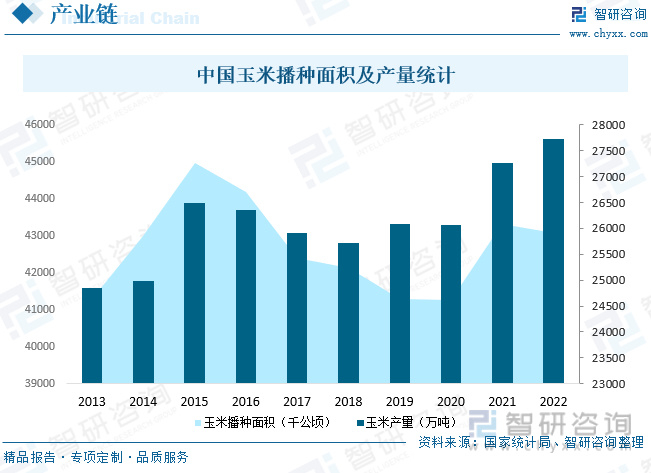 玉米淀粉行业上游包括玉米种植生产,中国是世界上最大的玉米生产国之一,2022年中国玉米播种面积共计43070千公顷,玉米产量达27720.3万吨,中国玉米持续增产,为玉米淀粉行业发展提供了充足的原材料。